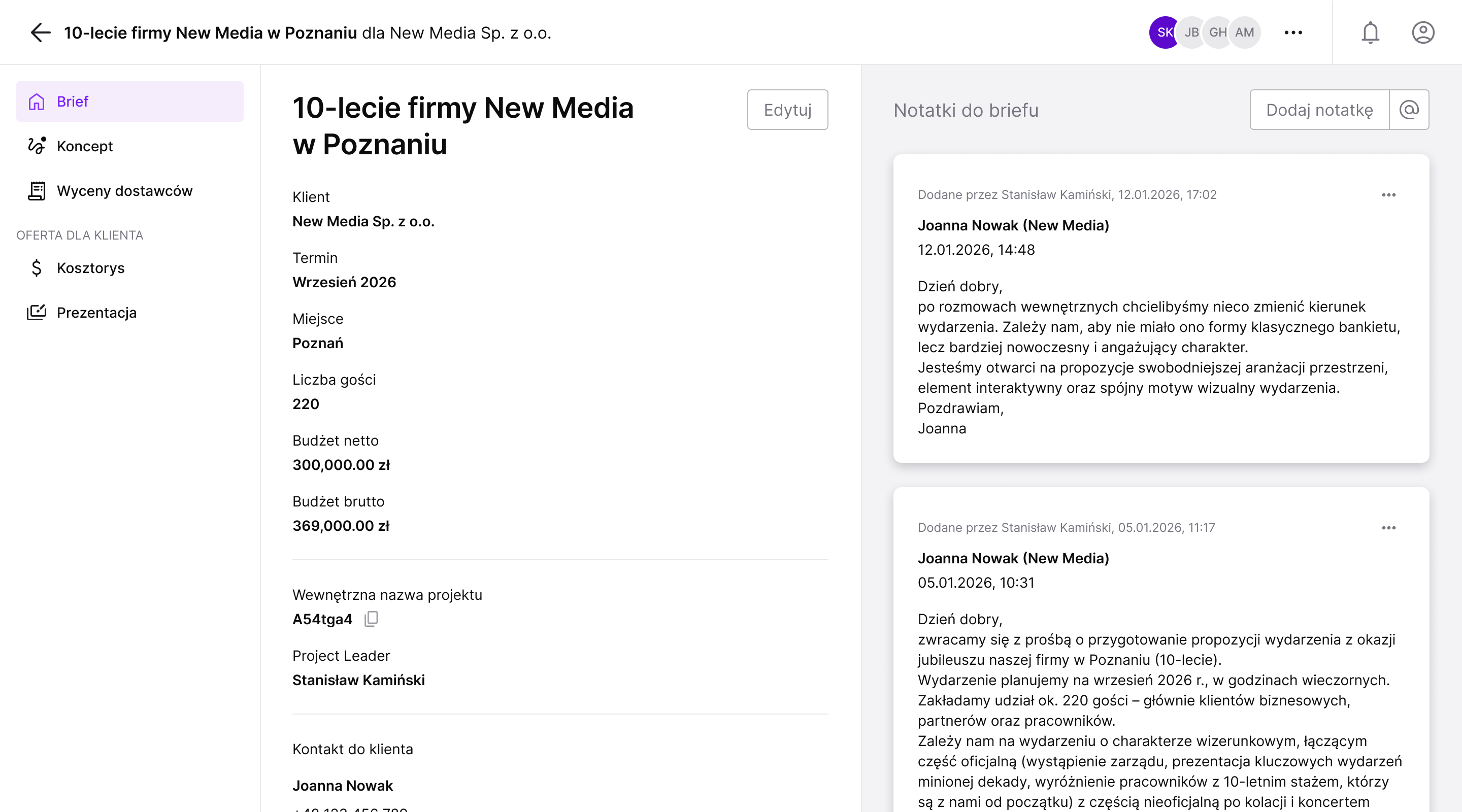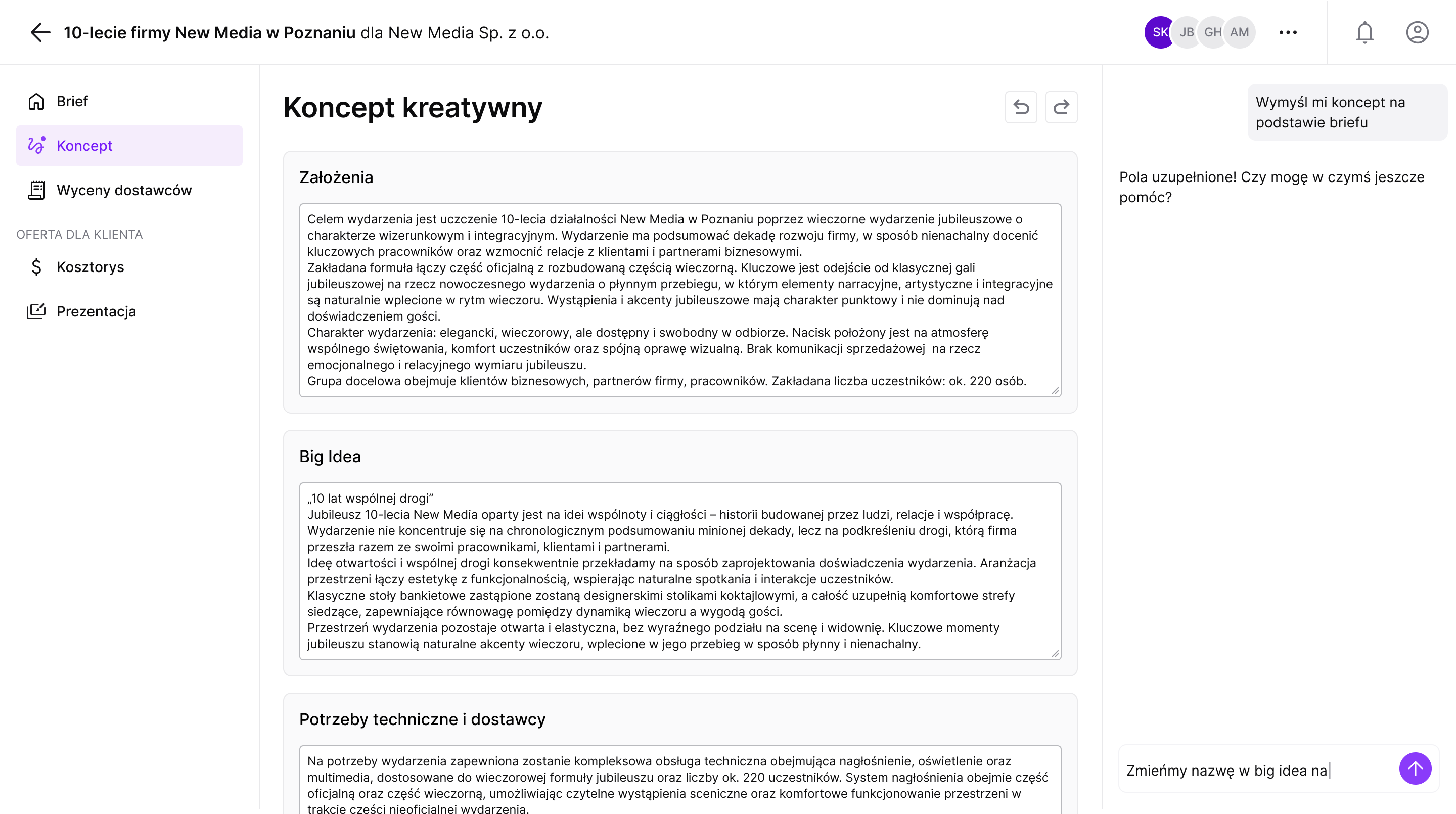 Sugerowane treści slajdów na podstawie briefu i kosztorysu,