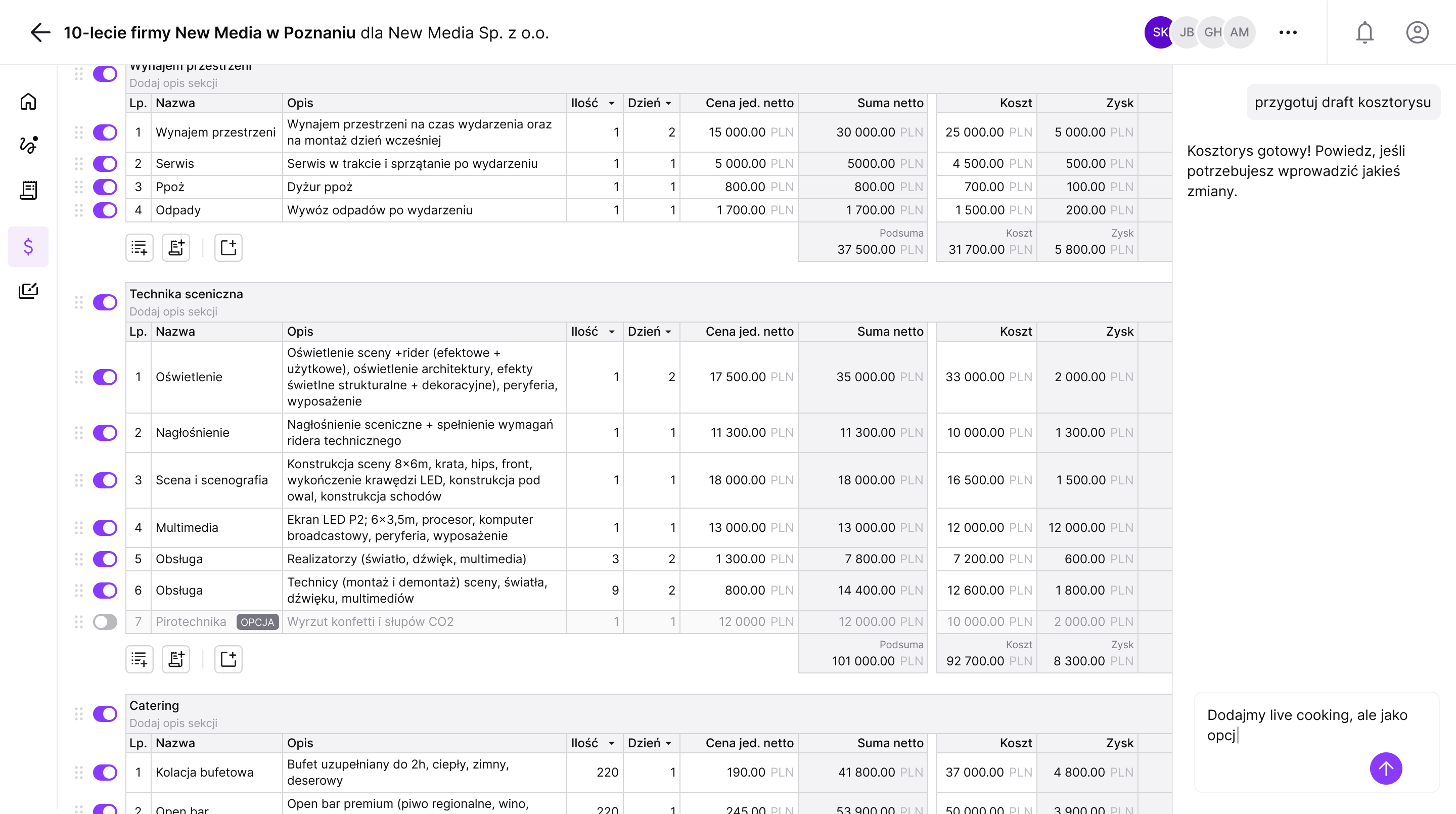 Planeroo analizuje poprzednie briefy, wyceny i kosztorysy, aby sugerować trafne pozycje i sekcje dla podobnych wydarzeń.